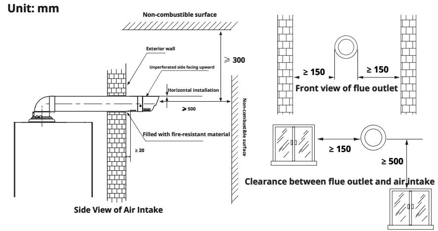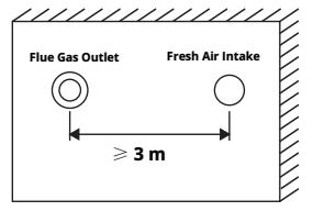 - The connection between the exhaust pipe hole and the wall leading to the outside should have no gaps that allow exhaust gas to enter the room, and it should be filled with flame-retardant materials. The air intake hole should be at least 20mm away from the wall, and the connecting part should be free of leaks.