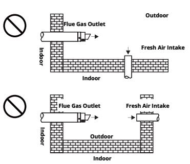 - The distance between the exhaust port and the new air outlet must ensure that the discharged smoke does not enter the room, and the position of the exhaust port and the new air outlet should be as far away as possible.