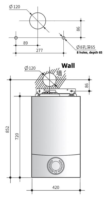 - When the distance to the combustible wall surface is less than 150mm, heat insulation boards should be installed on both sides. The distance from the heat insulation board to the left and right sides of the wall-mounted boiler should be more than 45mm.