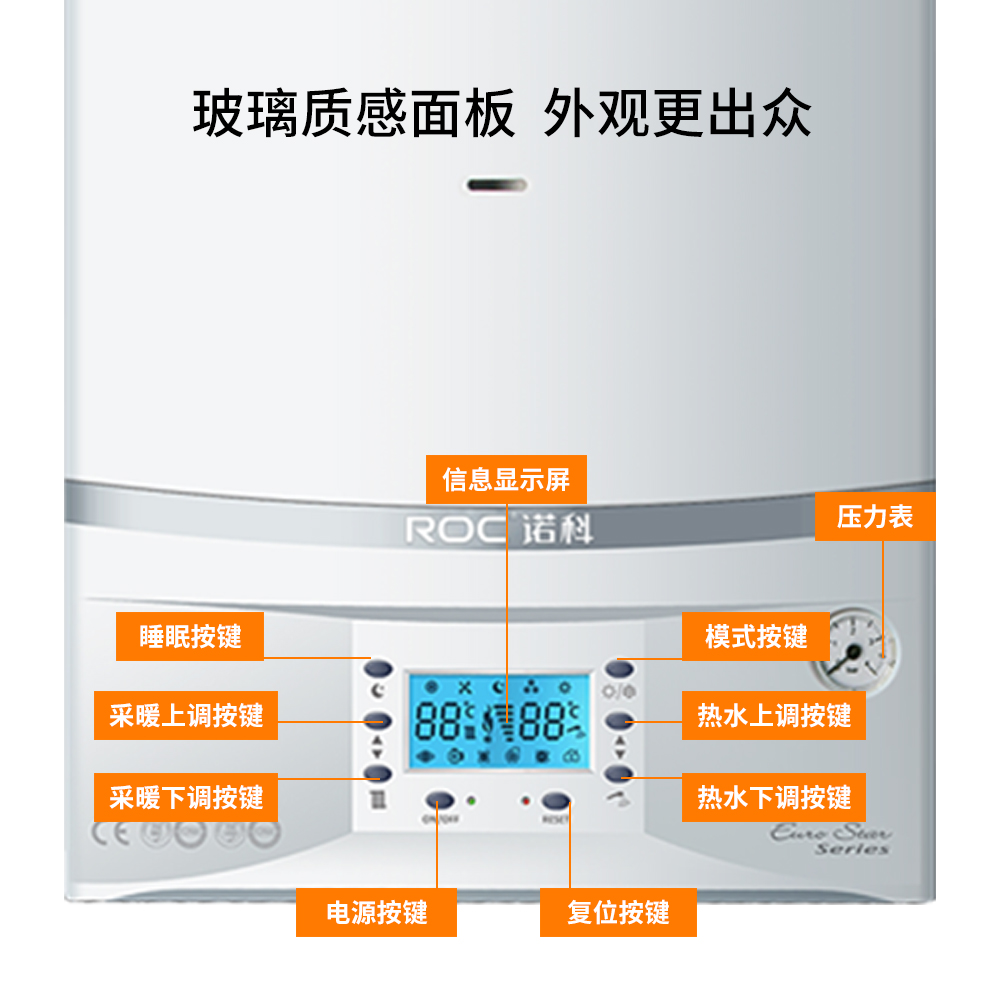 E 系列燃气壁挂炉采用经典按键式设计,操作便捷,易于上手。产品配备多重安全防护系统,构建全面可靠的安全保障。动态温度显示功能可实时掌握设备运行状态,调节更加直观。结合 ISO 认证的品质保障,为家庭提供稳定、安全且易于使用的采暖与生活热水解决方案。